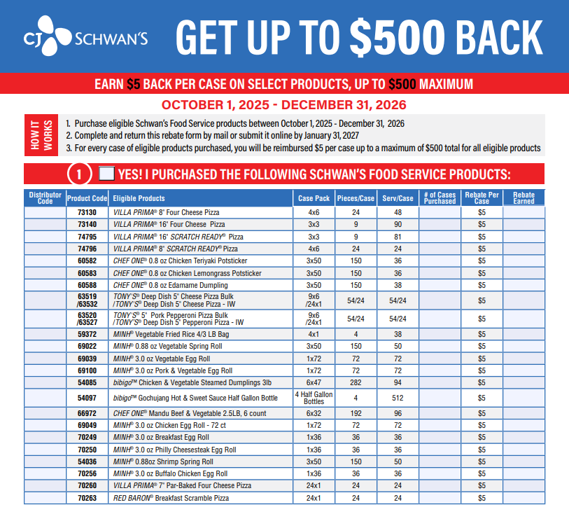 Resources Schwan’s Foodservice Resources Get guides, tools and recipes to make the most of your menu. Product Resources Total Product Guide Asian Product Guide Pizza Product Guide Wok to Order Guide Build Your Own Action Station Guide Dumpling Serving Guide MINH® Fried Rice Guide K-12 Dumpling Service Model Guide Asian Action Station Look Book Asian Appetizers Look Book Villa Prima Look Book Featured Recipes BIG DADDY’S™ Recipes VILLA PRIMA® Recipes MINH® Recipes CHEF ONE® Recipes TWIN MARQUIS® Recipes Tools & Rewards Commodity Planner The KITCHEN CIRCLE™ BIG DADDY’S™ Participation Calculator C-Store Point-of-Purchase Materials Win with Asian in C-Stores Menu Inspiration: Dough & Asian KITCHEN CIRCLE™ Triple Play Promotion Distributor Rebate Operator Rebate Videos Preparing a VILLA PRIMA® pizza into a Calzone CHEF ONE® Dumpling Stir Fry Recipe BIG DADDY’S™ Whole Grain Scratch Ready Pizza Preparation Preparing Yakisoba Noodles
