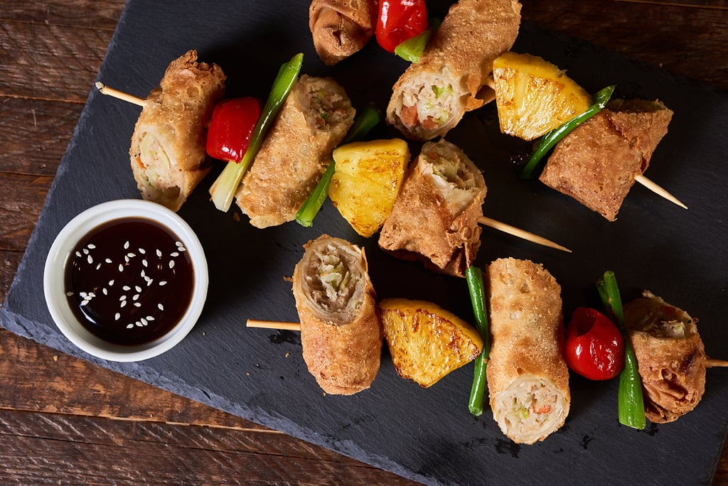 Leverage a street food vibe by threading pieces of fried egg rolls or dumplings on skewers for a kabob mash-up.